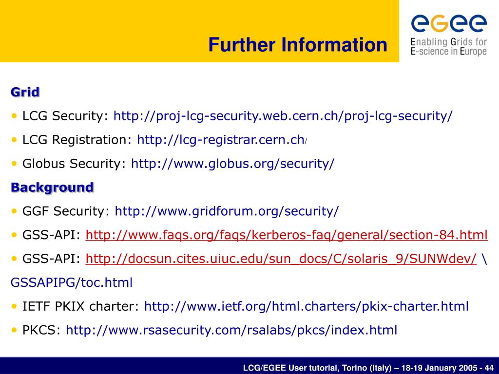 Further Information Grid • LCG Security: http://proj-lcg-security.web.cern.ch/proj-lcg-security/ • LCG Registration: http://lcg-registrar.cern.ch/ • Globus Security: http://www.globus.org/security/ Background • GGF Security: http://www.gridforum.org/security/ • GSS-API: http://www.faqs.org/faqs/kerberos-faq/general/section-84.html • GSS-API:http://docsun.cites.uiuc.edu/sun_docs/C/solaris_9/SUNWdev/ \ • GSSAPIPG/toc.html • IETF PKIX charter: http://www.ietf.org/html.charters/pkix-charter.html • PKCS: http://www.rsasecurity.com/rsalabs/pkcs/index.html LCG/EGEE User tutorial, Torino (Italy) – 18-19 January 2005 - 44