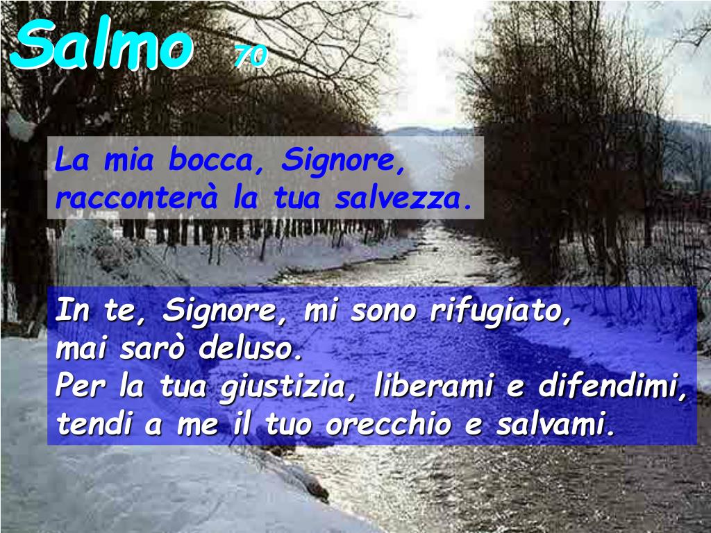 Salmo 70 La mia bocca, Signore, racconterà la tua salvezza. In te, Signore, mi sono rifugiato,mai sarò deluso.Per la tua giustizia, liberami e difendimi,tendi a me il tuo orecchio e salvami.