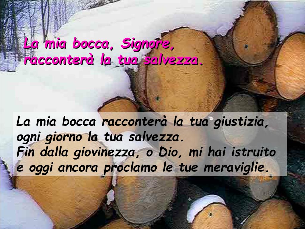 La mia bocca, Signore, racconterà la tua salvezza. La mia bocca racconterà la tua giustizia,ogni giorno la tua salvezza.Fin dalla giovinezza, o Dio, mi hai istruitoe oggi ancora proclamo le tue meraviglie.