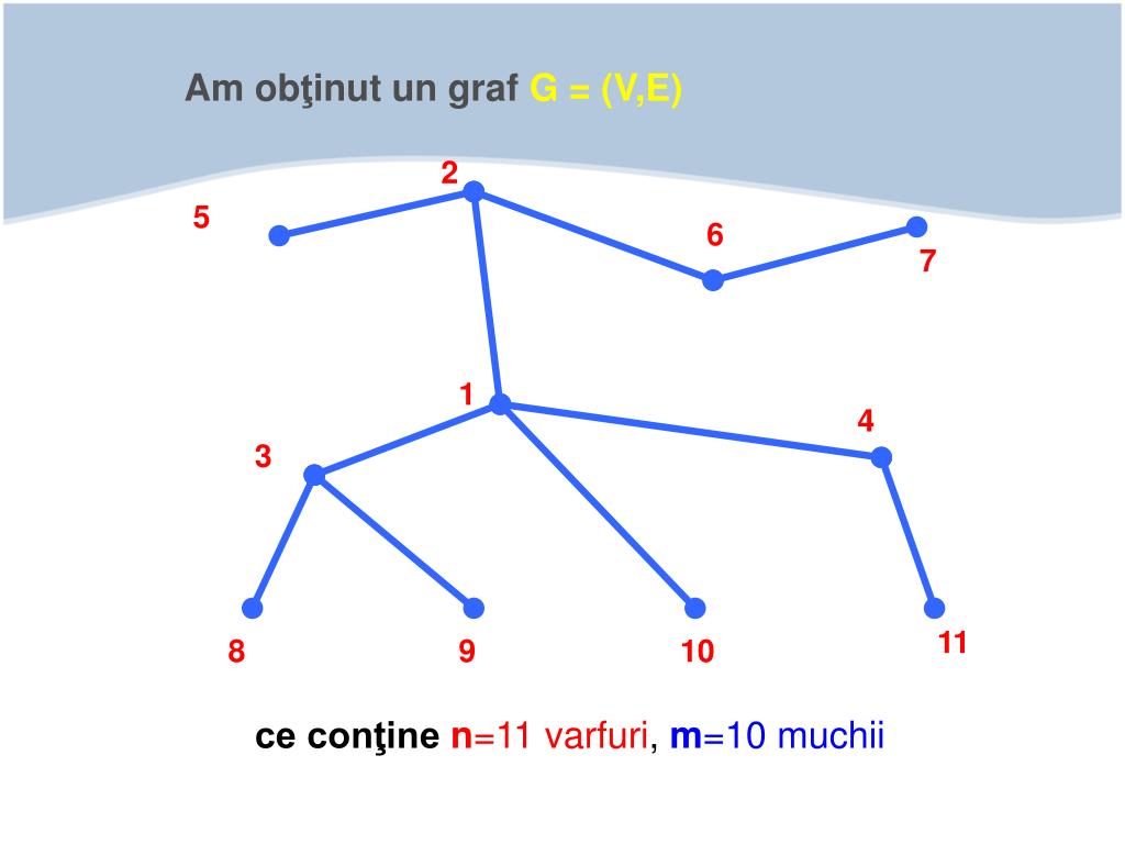 Am obţinut un grafG = (V,E) 2 5 6 7 1 4 3 11 8 9 10 ce conţine n=11 varfuri, m=10 muchii