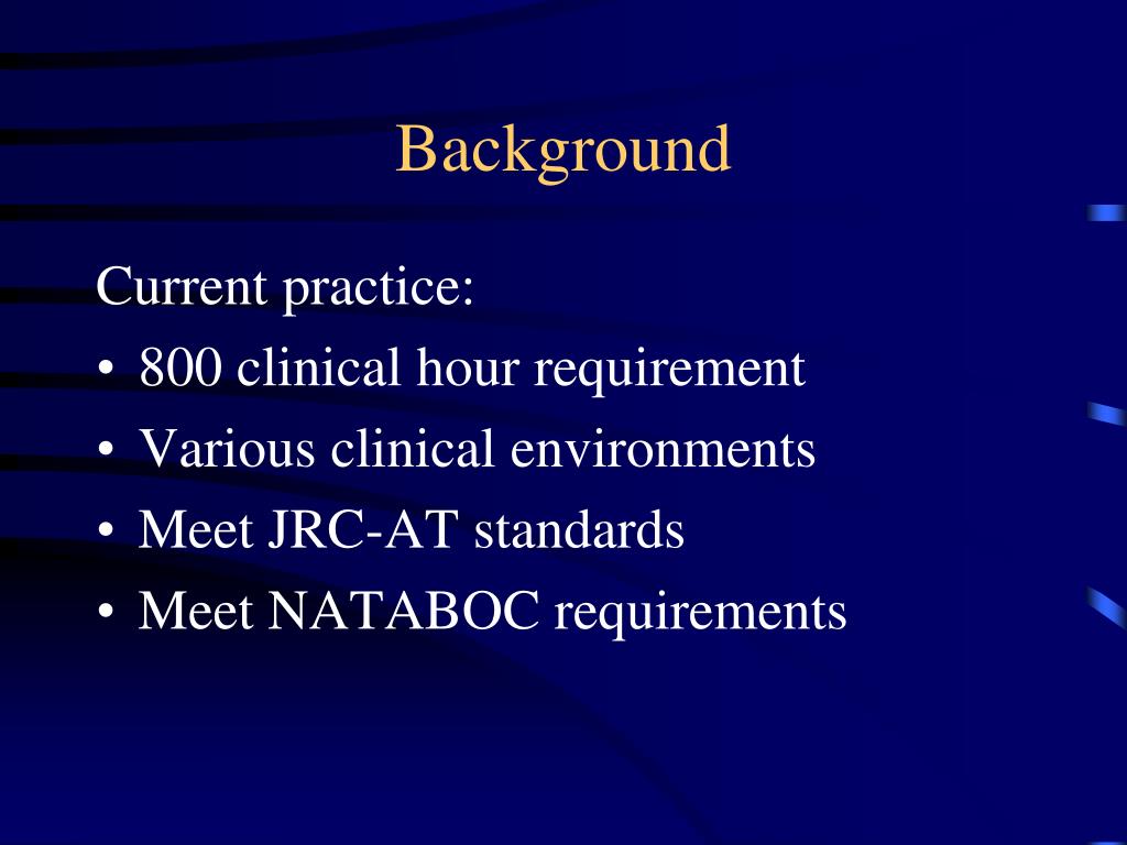 Background Current practice: • 800 clinical hour requirement • Various clinical environments • Meet JRC-AT standards • Meet NATABOC requirements