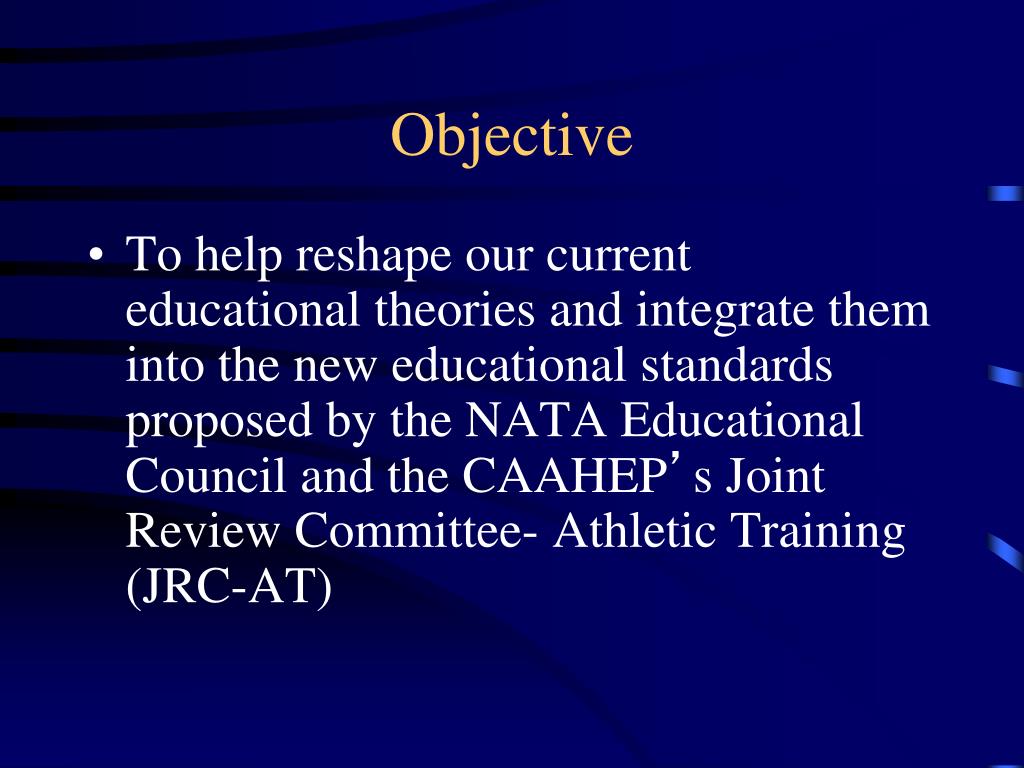 Objective • To help reshape our current educational theories and integrate them into the new educational standards proposed by the NATA Educational Council and the CAAHEP’s Joint Review Committee- Athletic Training (JRC-AT)