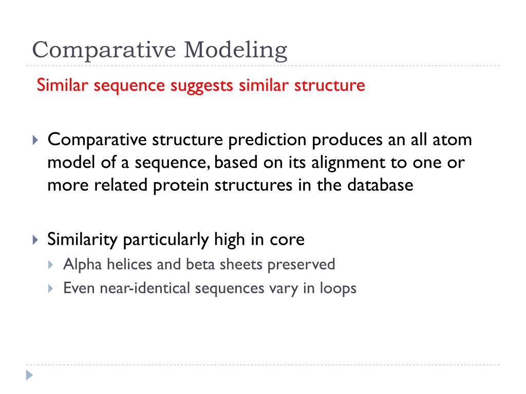 Comparative Modeling Similar sequence suggests similar structure • Comparative structure prediction produces an all atom model of a sequence, based on its alignment to one or more related protein structures in the database • Similarity particularly high in core • Alpha helices and beta sheets preserved • Even near-identical sequences vary in loops