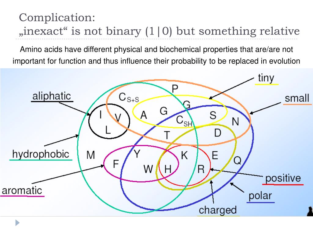 Complication:„inexact“ is not binary (1|0) but something relative Amino acids have different physical and biochemical properties that are/are not important for function and thus influence their probability to be replaced in evolution
