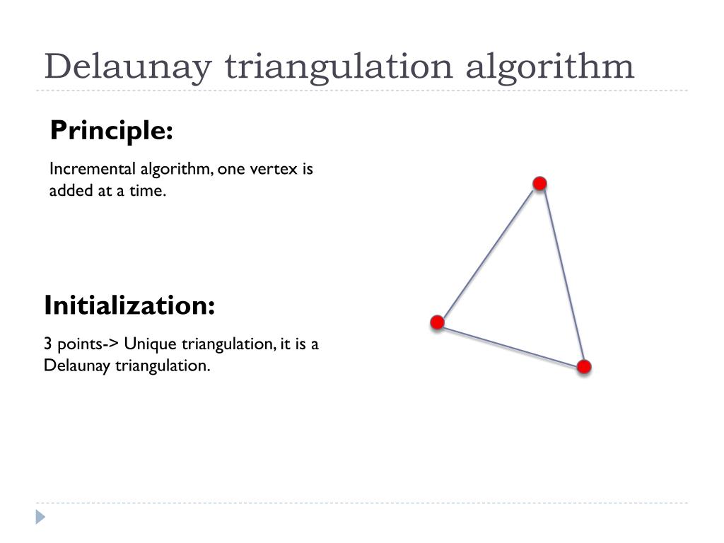 Delaunay triangulation algorithm Principle: Incremental algorithm, one vertex is added at a time. Initialization: 3 points-> Unique triangulation, it is a Delaunay triangulation.