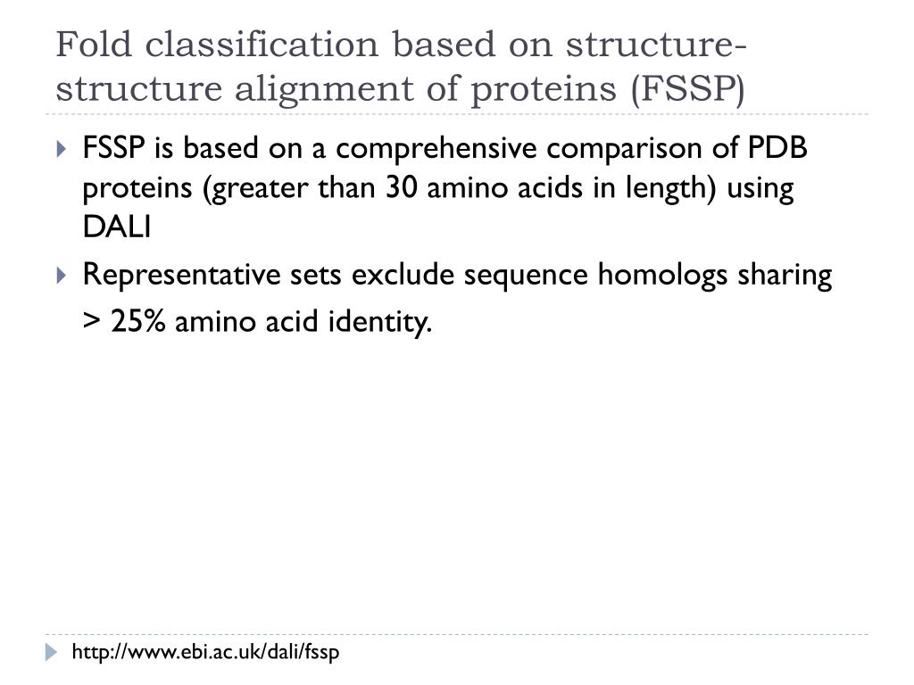 Fold classification based on structure-structure alignment of proteins (FSSP) • FSSP is based on a comprehensive comparison of PDB proteins (greater than 30 amino acids in length) using DALI • Representative sets exclude sequence homologs sharing > 25% amino acid identity. http://www.ebi.ac.uk/dali/fssp Page 293