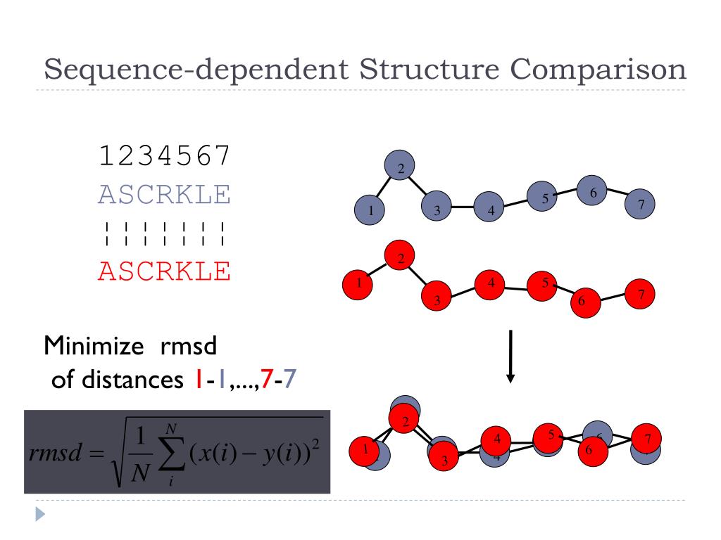 2 2 6 6 5 5 7 7 1 1 3 3 4 4 2 2 1 1 4 4 5 5 7 7 3 3 6 6 Sequence-dependent Structure Comparison 1234567 ASCRKLE ¦¦¦¦¦¦¦ ASCRKLE Minimizermsd of distances1-1,...,7-7