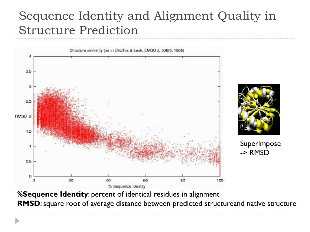 Sequence Identity and Alignment Quality in Structure Prediction Superimpose -> RMSD %Sequence Identity: percent of identical residues in alignment RMSD: square root of average distance between predicted structureandnative structure