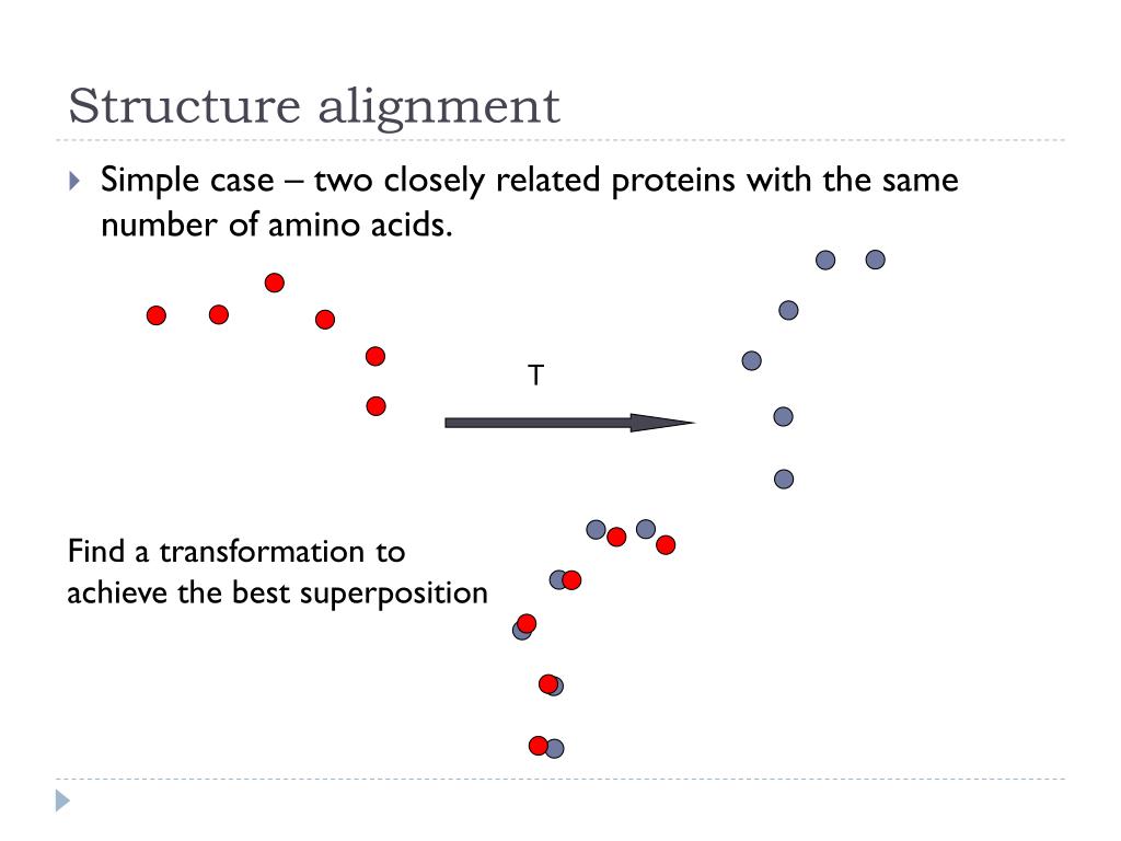 T Find a transformation to achieve the bestsuperposition Structure alignment • Simple case – two closely related proteins with the same number of amino acids.