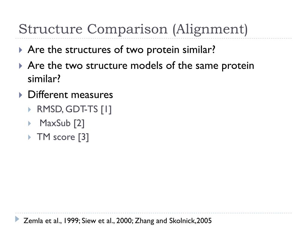 Structure Comparison (Alignment) • Are the structures of two protein similar? • Are the two structure models of the same protein similar? • Different measures • RMSD, GDT-TS [1] • MaxSub [2] • TM score [3] Zemla et al., 1999; Siew et al., 2000; Zhang and Skolnick,2005