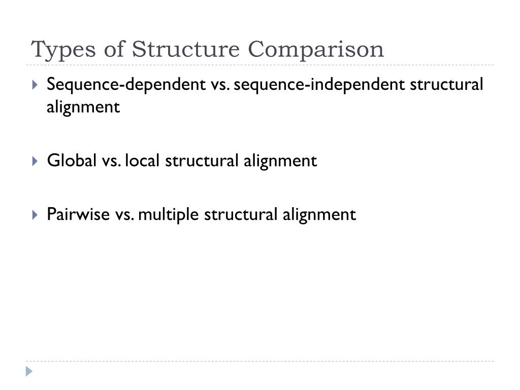 Types of Structure Comparison • Sequence-dependent vs. sequence-independent structural alignment • Global vs. local structural alignment • Pairwise vs. multiple structural alignment
