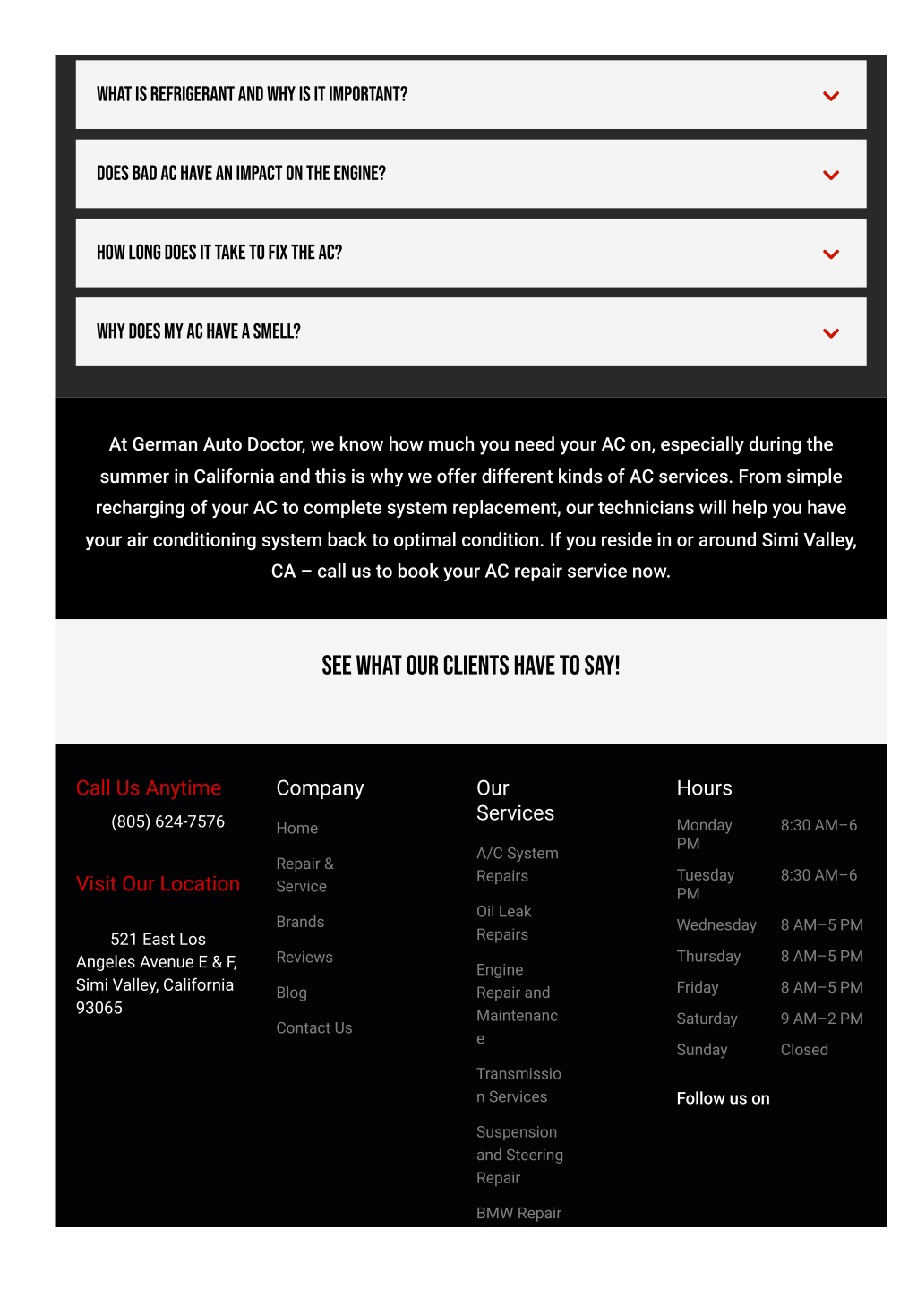 3. 3 3 What is refrigerant and why is it important? 3 3 Does bad AC have an impact on the engine? 3 3 How long does it take to fix the AC? 3 3 Why does my AC have a smell? At German Auto Doctor, we know how much you need your AC on, especially during the summer in California and this is why we offer different kinds of AC services. From simple recharging of your AC to complete system replacement, our technicians will help you have your air conditioning system back to optimal condition. If you reside in or around Simi Valley, CA – call us to book your AC repair service now. See What Our Clients Have To Say! Call Us Anytime Company Our Services Hours (805) 624-7576 Monday PM 8:30 AM–6 Home A/C System Repair & Tuesday PM 8:30 AM–6 Repairs Visit Our Location Service Oil Leak Brands Wednesday 8 AM–5 PM Repairs 521 East Los Angeles Avenue E & F, Simi Valley, California 93065 Thursday 8 AM–5 PM Reviews Engine Friday 8 AM–5 PM Blog Repair and Maintenanc Saturday 9 AM–2 PM Contact Us e Sunday Closed Transmissio n Services Follow us on Suspension and Steering Repair BMW Repair