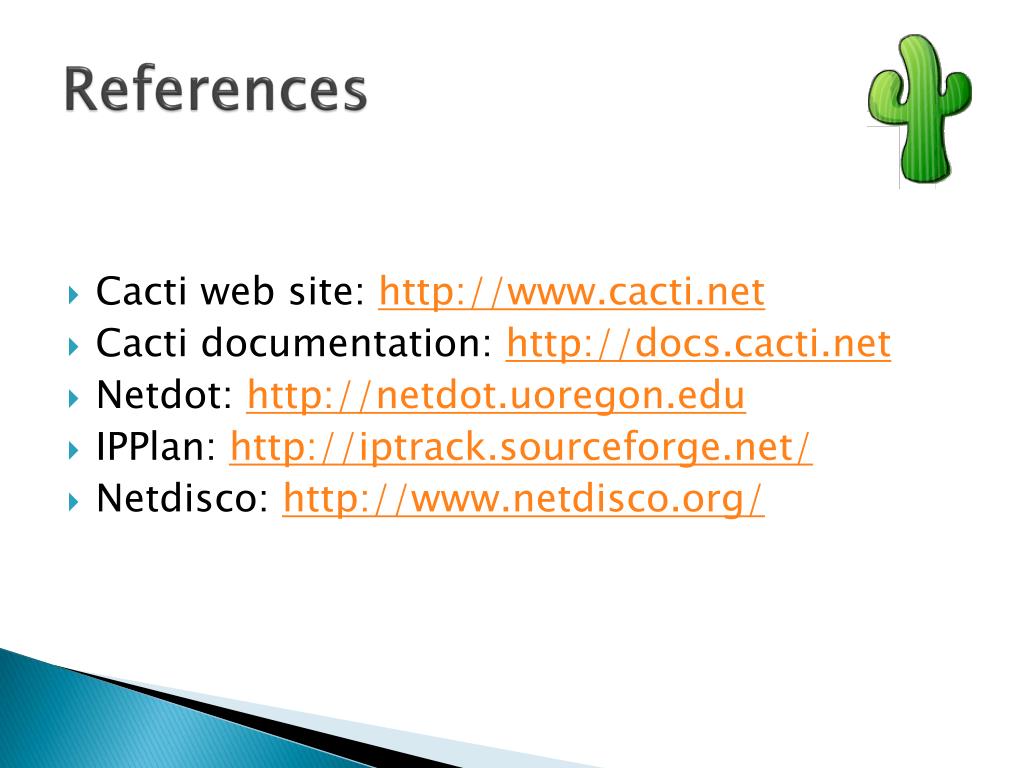 References • Cacti web site: http://www.cacti.net • Cacti documentation: http://docs.cacti.net • Netdot: http://netdot.uoregon.edu • IPPlan: http://iptrack.sourceforge.net/ • Netdisco: http://www.netdisco.org/
