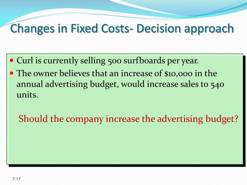 Changes in Fixed Costs- Decision approach • Curl is currently selling 500 surfboards per year. • The owner believes that an increase of $10,000 in the annual advertising budget, would increase sales to 540 units. • Should the company increase the advertising budget?