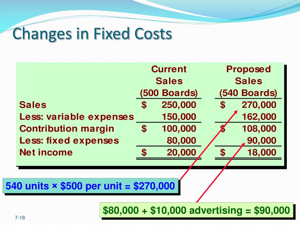 Changes in Fixed Costs 540 units × $500 per unit = $270,000 $80,000 + $10,000 advertising = $90,000