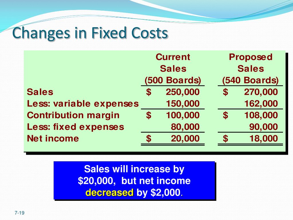 Changes in Fixed Costs Sales will increase by $20,000, but net income decreasedby $2,000.