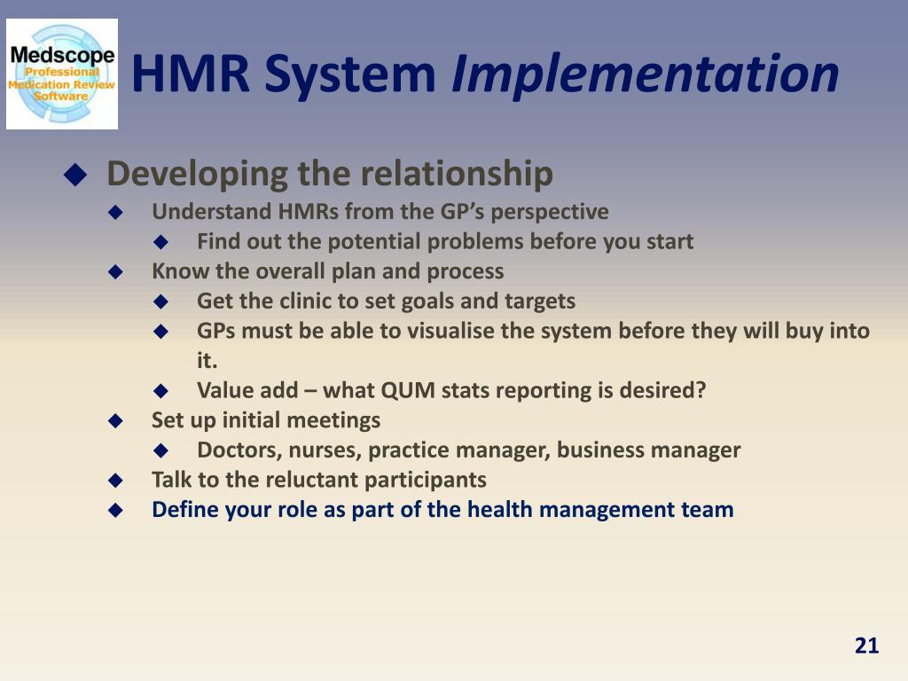 HMR System Implementation • Developing the relationship • Understand HMRs from the GP’s perspective • Find out the potential problems before you start • Know the overall plan and process • Get the clinic to set goals and targets • GPs must be able to visualise the system before they will buy into it. • Value add – what QUM stats reporting is desired? • Set up initial meetings • Doctors, nurses, practice manager, business manager • Talk to the reluctant participants • Define your role as part of the health management team
