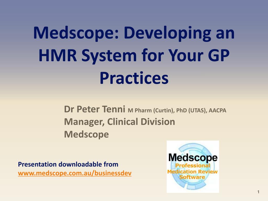 Medscope: Developing an HMR System for Your GP Practices Dr Peter Tenni M Pharm (Curtin), PhD (UTAS), AACPA Manager, Clinical Division Medscope Presentation downloadable from www.medscope.com.au/businessdev