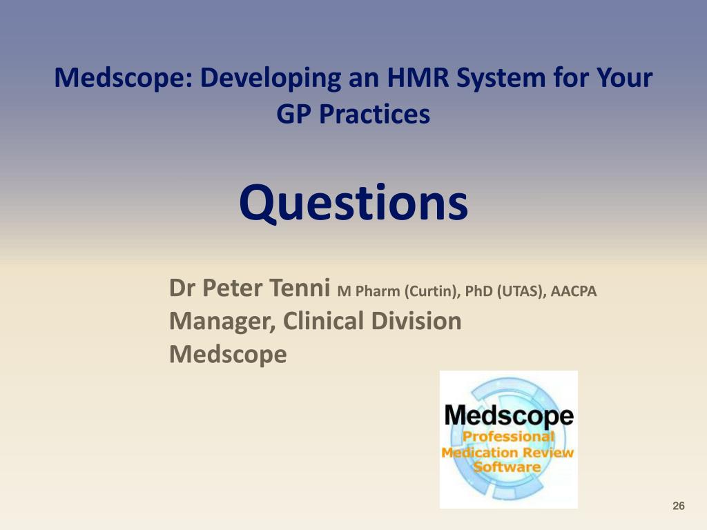 Medscope: Developing an HMR System for Your GP PracticesQuestions Dr Peter Tenni M Pharm (Curtin), PhD (UTAS), AACPA Manager, Clinical Division Medscope