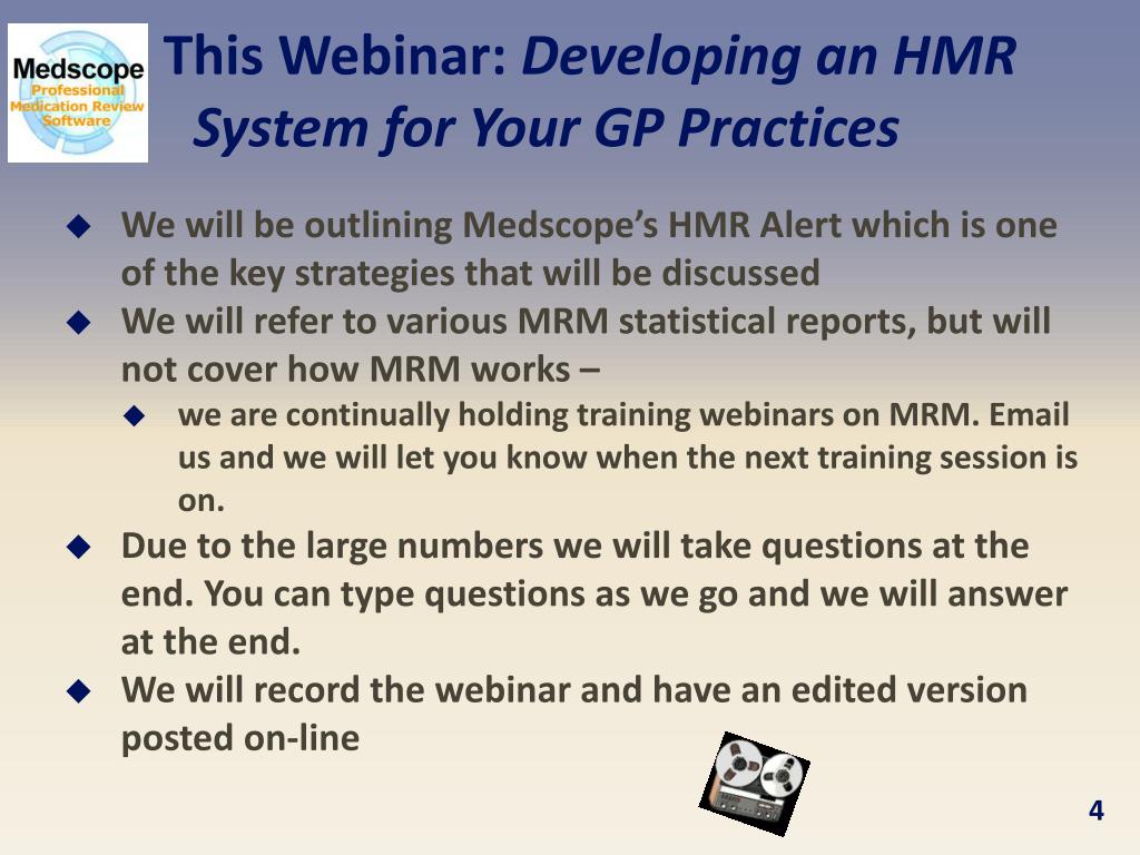 This Webinar: Developing an HMR System for Your GP Practices • We will be outlining Medscope’s HMR Alert which is one of the key strategies that will be discussed • We will refer to various MRM statistical reports, but will not cover how MRM works – • we are continually holding training webinars on MRM. Email us and we will let you know when the next training session is on. • Due to the large numbers we will take questions at the end. You can type questions as we go and we will answer at the end. • We will record the webinar and have an edited version posted on-line
