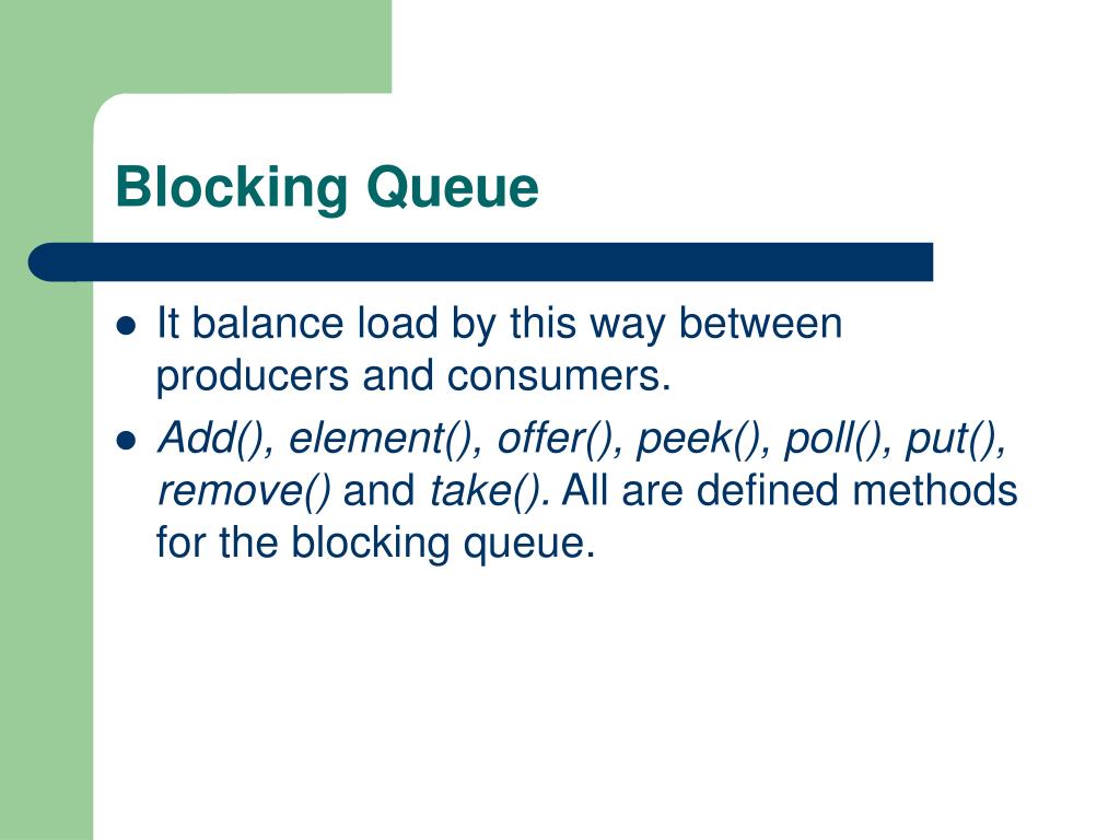 Blocking Queue • It balance load by this way between producers and consumers. • Add(), element(), offer(), peek(), poll(), put(), remove() and take(). All are defined methods for the blocking queue.