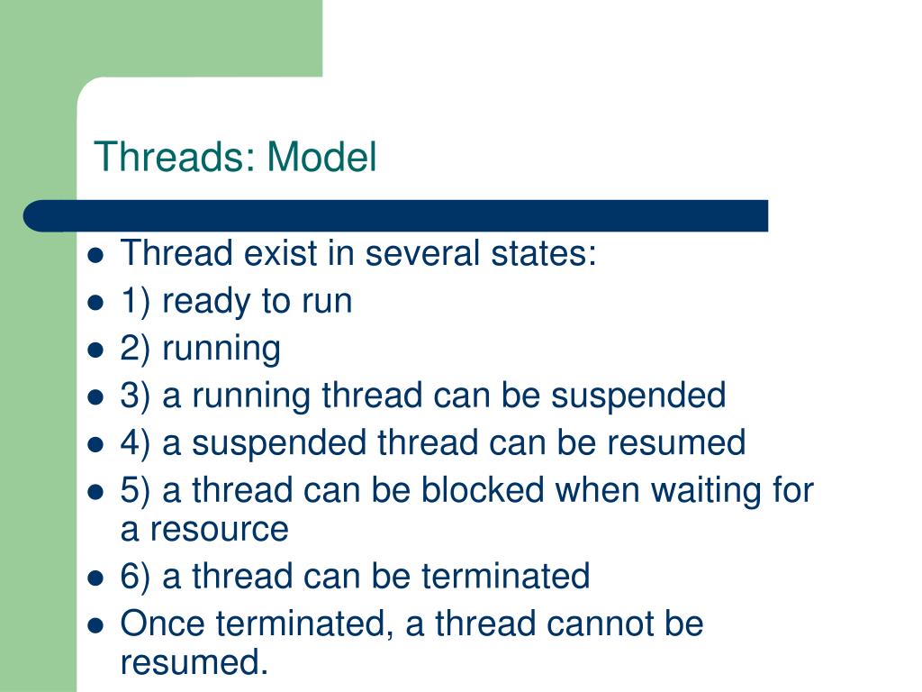 Threads: Model • Thread exist in several states: • 1) ready to run • 2) running • 3) a running thread can be suspended • 4) a suspended thread can be resumed • 5) a thread can be blocked when waiting for a resource • 6) a thread can be terminated • Once terminated, a thread cannot be resumed.