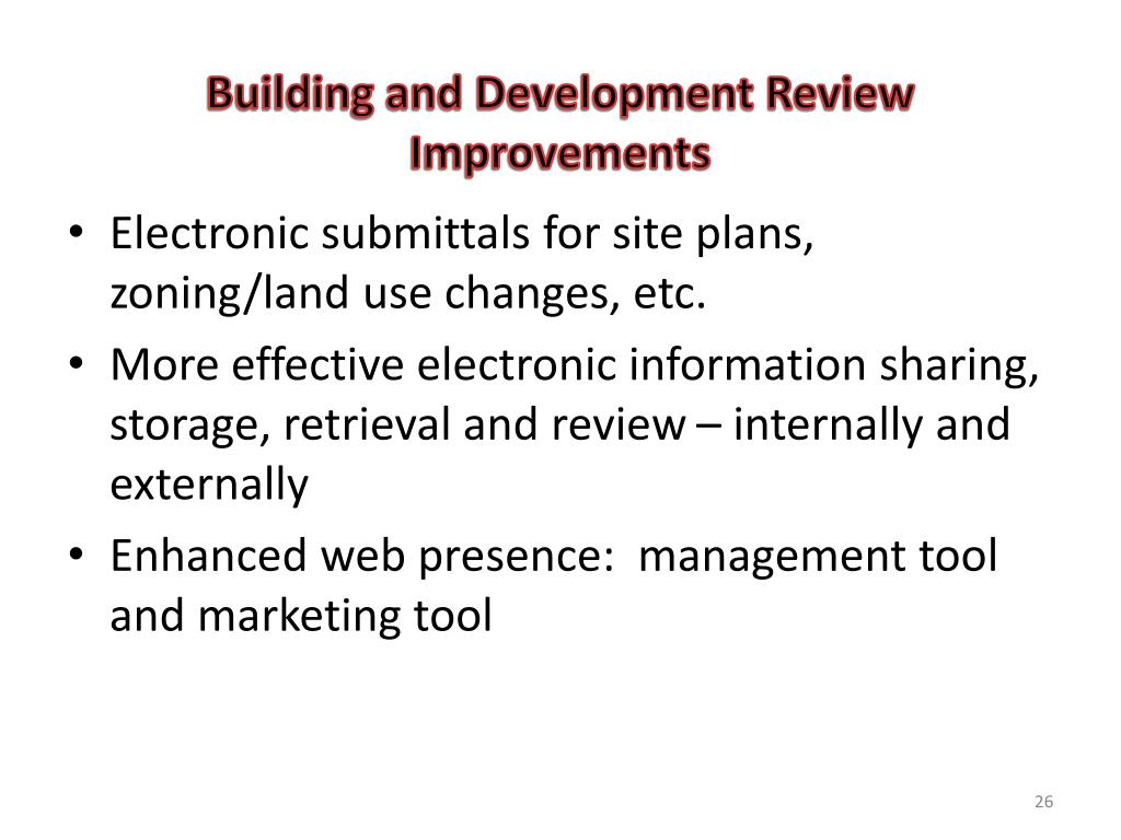 Building and Development Review Improvements • Electronic submittals for site plans, zoning/land use changes, etc. • More effective electronic information sharing, storage, retrieval and review – internally and externally • Enhanced web presence: management tool and marketing tool