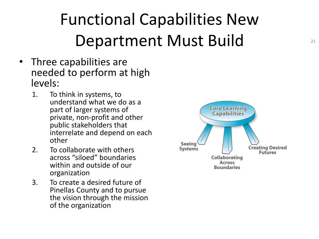 Functional Capabilities New Department Must Build • Three capabilities are needed to perform at high levels: • To think in systems, to understand what we do as a part of larger systems of private, non-profit and other public stakeholders that interrelate and depend on each other • To collaborate with others across “siloed” boundaries within and outside of our organization • To create a desired future of Pinellas County and to pursue the vision through the mission of the organization