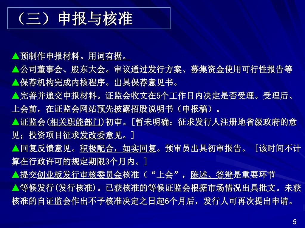 ▲预制作申报材料。用词有据。▲公司董事会、股东大会。审议通过发行方案、募集资金使用可行性报告等▲保荐机构完成内核程序。出具保荐意见书。▲完善并递交申报材料。证监会收文在5个工作日内决定是否受理。受理后、上会前,在证监会网站预先披露招股说明书(申报稿)。▲证监会(相关职能部门)初审。[暂未明确:征求发行人注册地省级政府的意见;投资项目征求发改委意见。]▲回复反馈意见。积极配合,如实回复。预审员出具初审报告。 [该时间不计算在行政许可的规定期限3个月内。] ▲提交创业板发行审核委员会核准(“上会”,陈述、答辩是重要环节▲等候发行(发行核准)。已获核准的等候证监会根据市场情况出具批文。未获核准的自证监会作出不予核准决定之日起6个月后,发行人可再次提出申请。