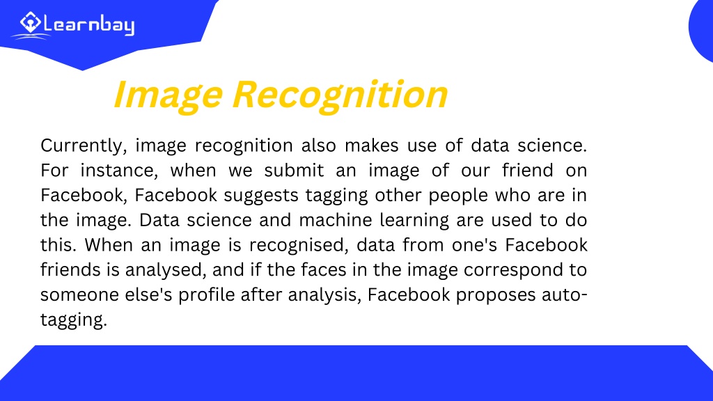 Image Recognition For instance, when we submit an image of our friend on Facebook, Facebook suggests tagging other people who are in the image. Data science and machine learning are used to do this. When an image is recognised, data from one's Facebook friends is analysed, and if the faces in the image correspond to someone else's profile after analysis, Facebook proposes auto- tagging. Currently, image recognition also makes use of data science.