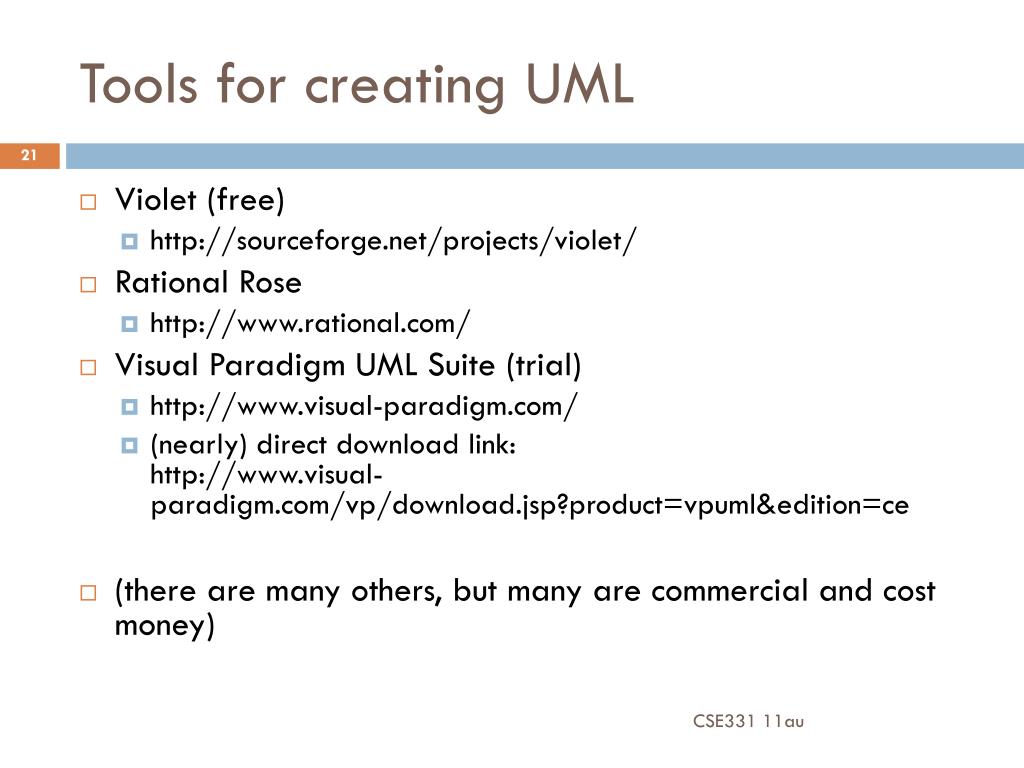 Tools for creating UML • Violet (free) • http://sourceforge.net/projects/violet/ • Rational Rose • http://www.rational.com/ • Visual Paradigm UML Suite (trial) • http://www.visual-paradigm.com/ • (nearly) direct download link:http://www.visual-paradigm.com/vp/download.jsp?product=vpuml&edition=ce • (there are many others, but many are commercial and cost money)