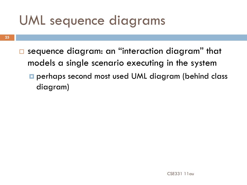 UML sequence diagrams • sequence diagram: an “interaction diagram” that models a single scenario executing in the system • perhaps second most used UML diagram (behind class diagram)