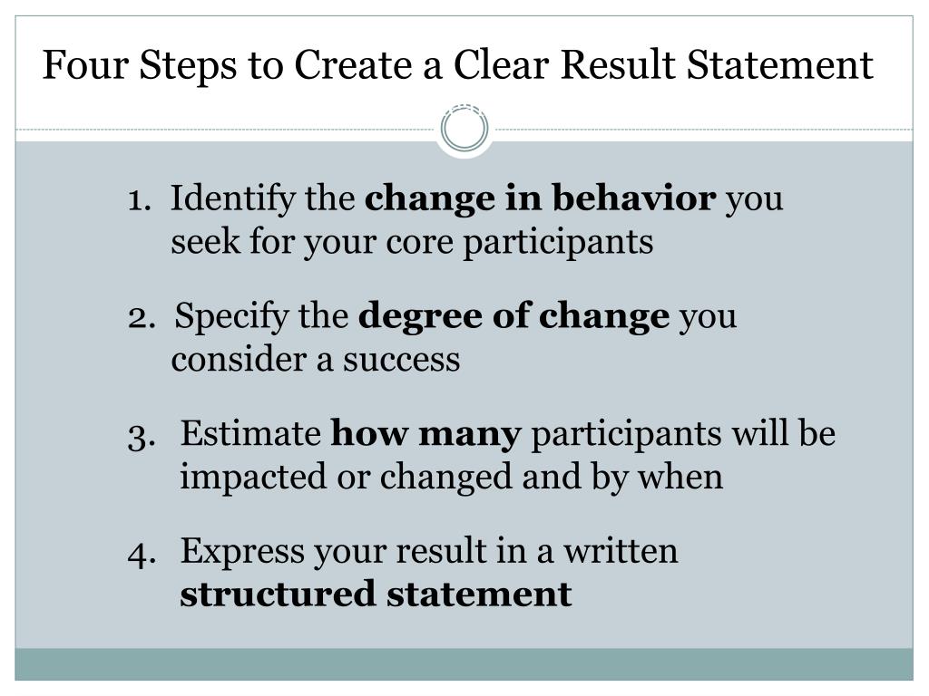 Four Steps to Create a Clear Result Statement Steps to Create a Clear Result Statement • 1. Identify the change in behavior you seek for your core participants • 2. Specify the degree of change you consider a success • Estimate how many participants will be impacted or changed and by when • Express your result in a written structured statement
