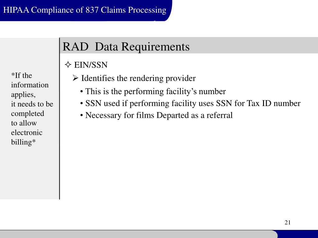 HIPAA Compliance of 837 Claims Processing RAD Data Requirements • EIN/SSN *If the information applies, it needs to be completed to allow electronic billing* • Identifies the rendering provider • This is the performing facility’s number • SSN used if performing facility uses SSN for Tax ID number • Necessary for films Departed as a referral