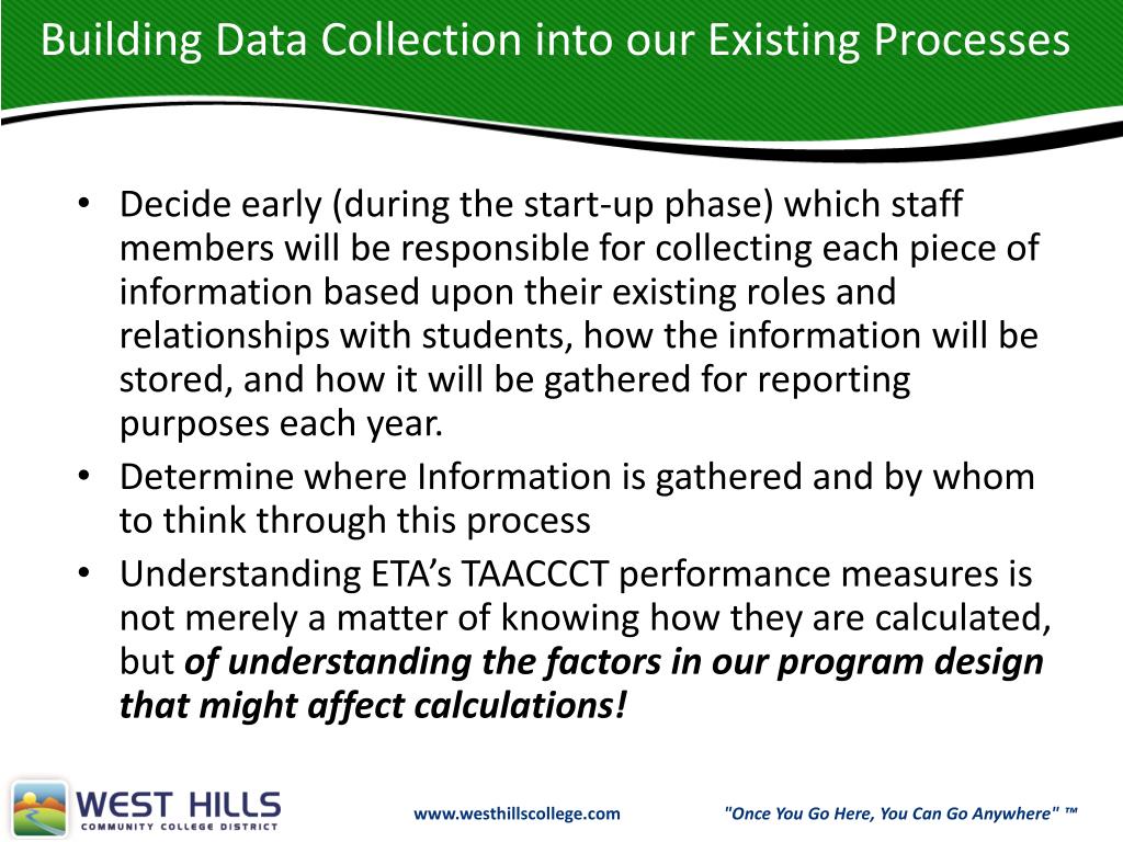 Building Data Collection into our Existing Processes Decide early (during the start-up phase) which staff members will be responsible for collecting each piece of information based upon their existing roles and relationships with students, how the information will be stored, and how it will be gathered for reporting purposes each year. Determine where Information is gathered and by whom to think through this process Understanding ETA’s TAACCCT performance measures is not merely a matter of knowing how they are calculated, but of understanding the factors in our program design that might affect calculations!