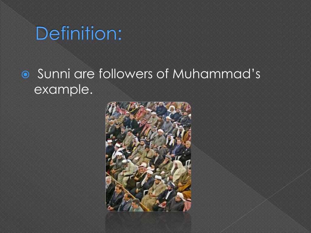 Sunni. By: Tianna Brewster Julia Schorner Pd. 3. Sunni. Definition:. Sunni are followers of Muhammad’s example. Sunni. Facts:. Sunni Islam is the largest branch of Islam. Followers of Sunni tradition are known as Sunnis or Sunnites.