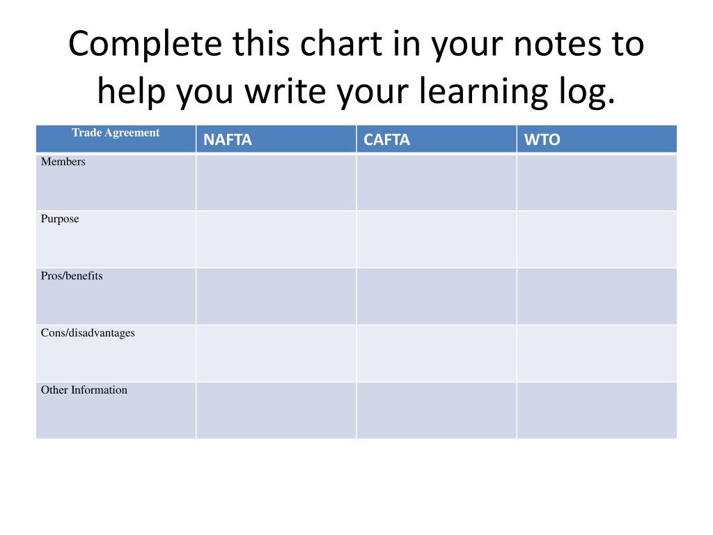 LEARNING LOG • Write a short essay on trade organizations. • The first paragraph should include information about the purpose of trade agreements and benefits of trade agreements to member countries. • The second paragraph should focus on economic interdependence and the disadvantages of trade agreements to members and nonmembers. • The third paragraph should focus on the student’s opinion about trade agreements and if a country should in fact become a member of such an organization.