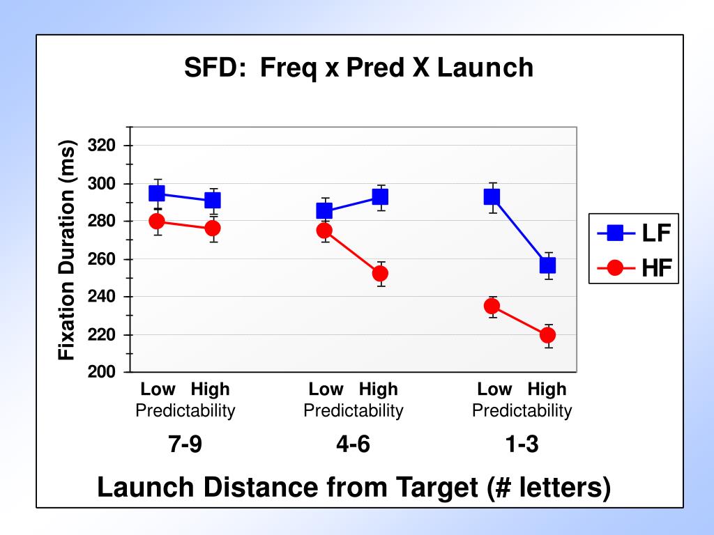 Materials & Design • Participants: 64 • Apparatus: Dual-Purkinje Eyetracker (Gen 5.5.) • Materials & Design: Conditions: Frequency (HF,LF) x Predictability (HP,LP) Targets: HF & LF targets matched pairwise on word length (5-8 letters; avg = xx) === HF === === LF === HPLPHPLP Frequency (BNC, per million) 145 145 4 4 Predictability (1-7) 6.19 4.07 6.11 3.69 Cloze probability 0.57 0.02 0.50 0.01