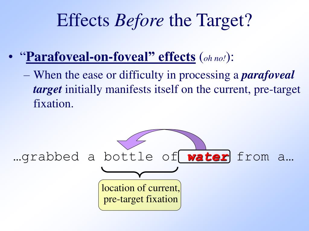 Effects Before the Target? …grabbed a bottle of water from a… location of current, pre-target fixation • “Parafoveal-on-foveal” effects (oh no!): • When the ease or difficulty in processing a parafoveal target initially manifests itself on the current, pre-target fixation.