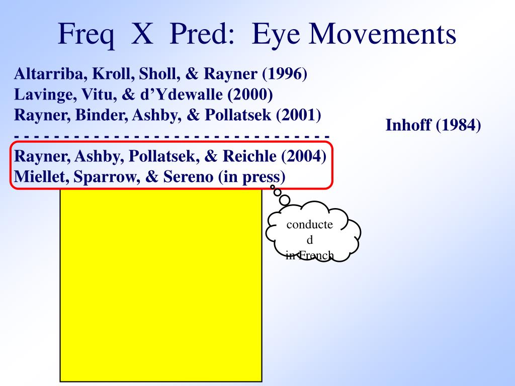 Freq X Pred: Eye Movements Altarriba, Kroll, Sholl, & Rayner (1996) Lavinge, Vitu, & d’Ydewalle (2000) Rayner, Binder, Ashby, & Pollatsek (2001) - - - - - - - - - - - - - - - - - - - - - - - - - - - - - - - - Rayner, Ashby, Pollatsek, & Reichle (2004) Miellet, Sparrow, & Sereno (in press) Inhoff (1984) conducted in French