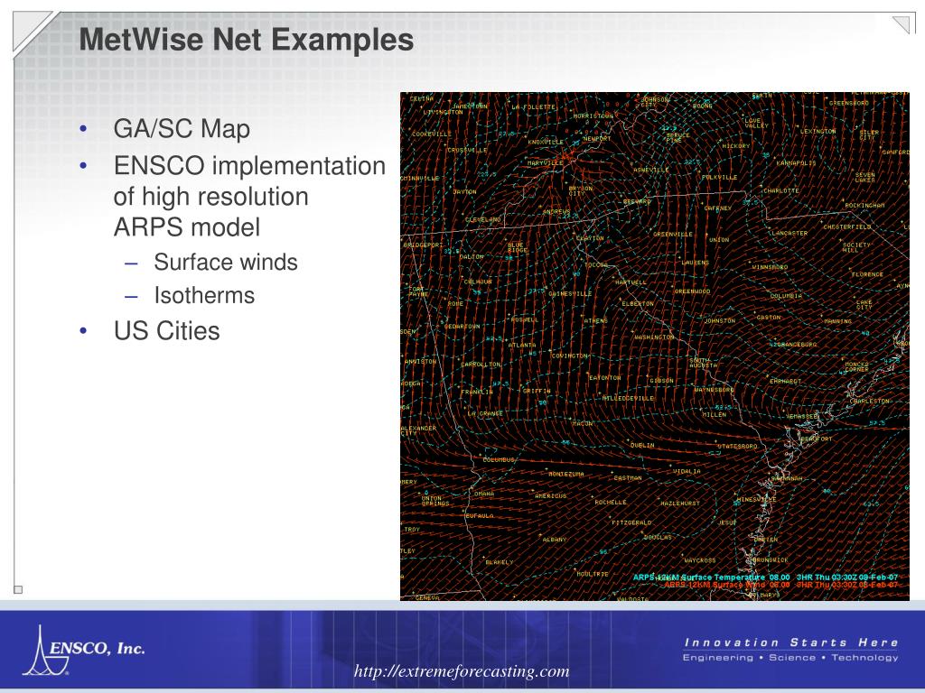 GA/SC Map ENSCO implementationof high resolutionARPS model Surface winds Isotherms US Cities MetWise Net Examples http://extremeforecasting.com