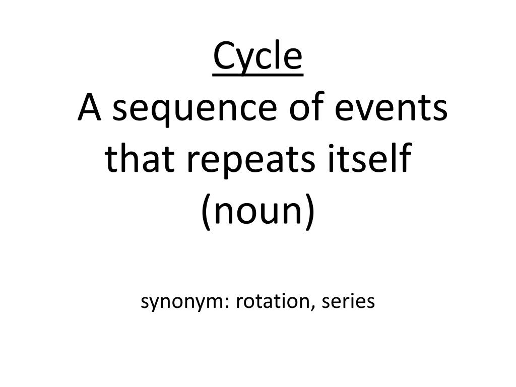 Cycle A sequence of events that repeats itself(noun)synonym: rotation, series