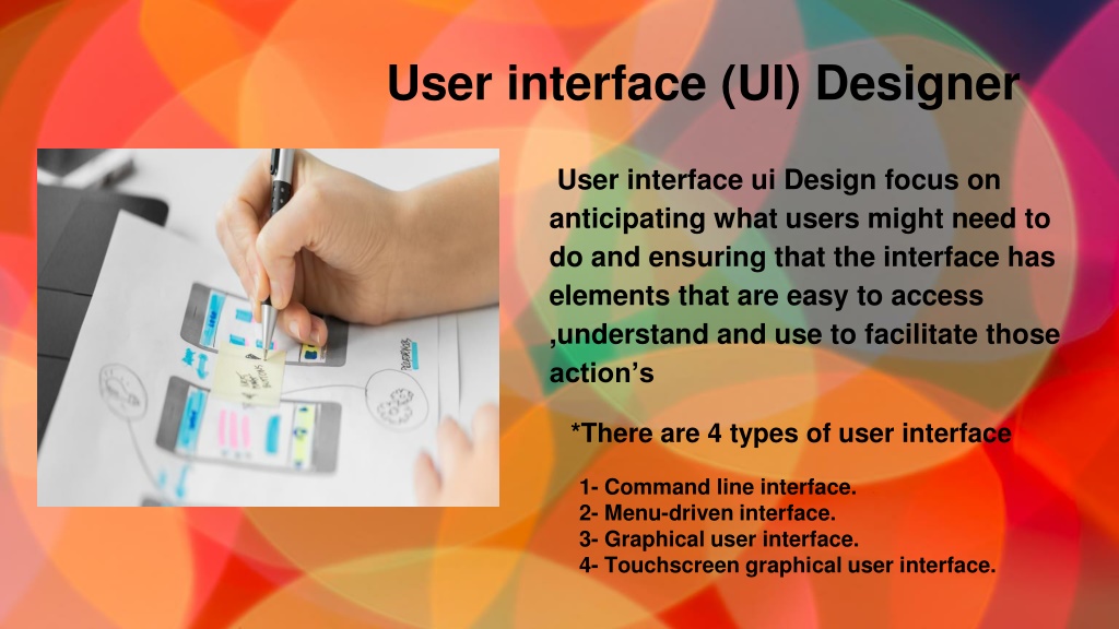 User interface (UI) Designer User interface ui Design focus on anticipating what users might need to do and ensuring that the interface has elements that are easy to access ,understand and use to facilitate those action’s *There are 4 types of user interface 1- Command line interface. 2- Menu-driven interface. 3- Graphical user interface. 4- Touchscreen graphical user interface.
