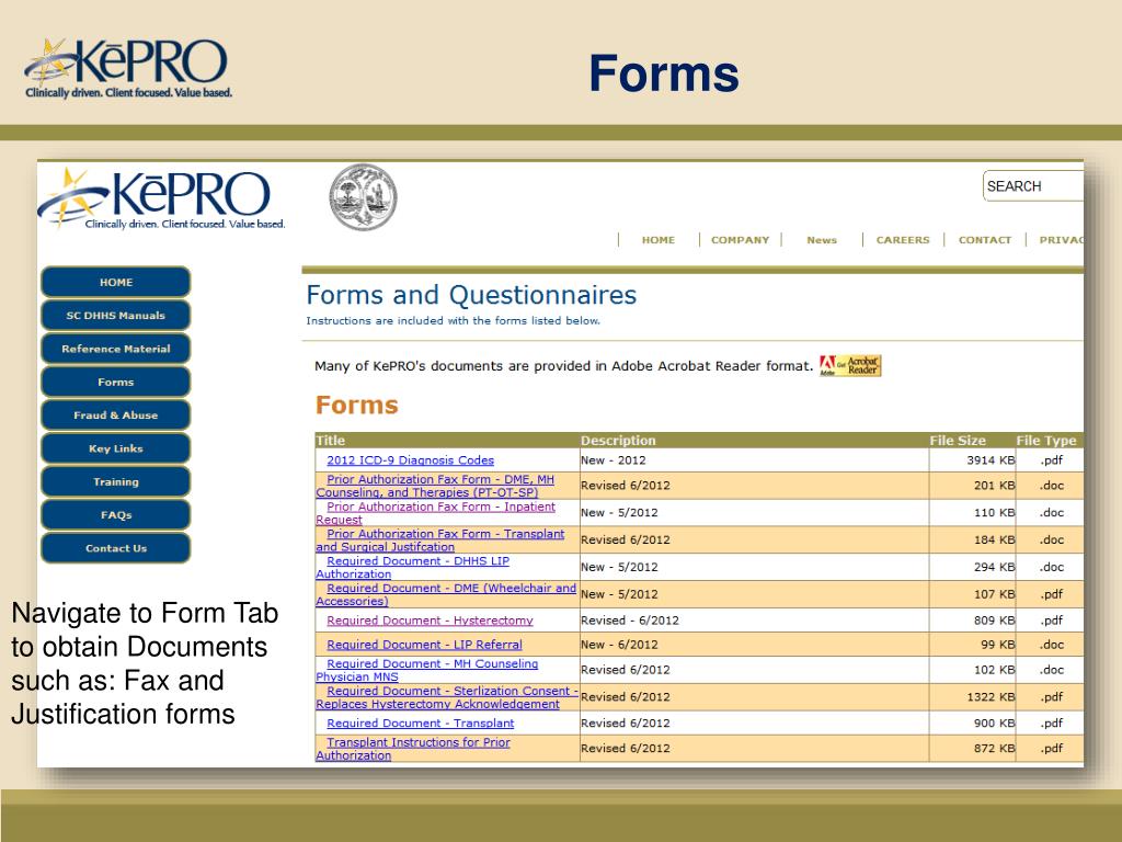 INTEGRATED CARE MANAGEMENT AND QUALITY IMPROVEMENT. South Carolina KePRO QIO Request Submission Requirements. Topics. Service Type(s) KePRO SCDHHS Website Service Type Requirements Contact Information. Prior Authorization Service Types. Therapies – (PT, OT, SP) Home Health Hospice