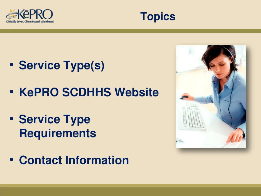 Topics • Service Type(s) • KePRO SCDHHS Website • Service Type Requirements • Contact Information