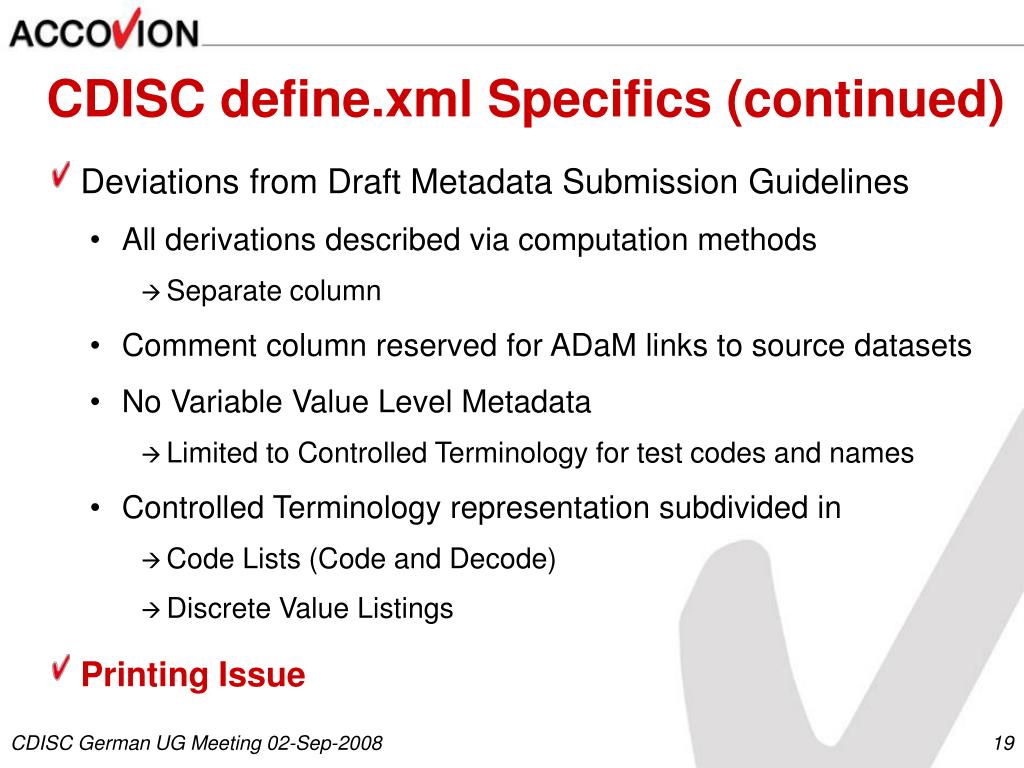 CDISC define.xml Specifics (continued) • Deviations from Draft Metadata Submission Guidelines • All derivations described via computation methods • Separate column • Comment column reserved for ADaM links to source datasets • No Variable Value Level Metadata • Limited to Controlled Terminology for test codes and names • Controlled Terminology representation subdivided in • Code Lists (Code and Decode) • Discrete Value Listings • Printing Issue