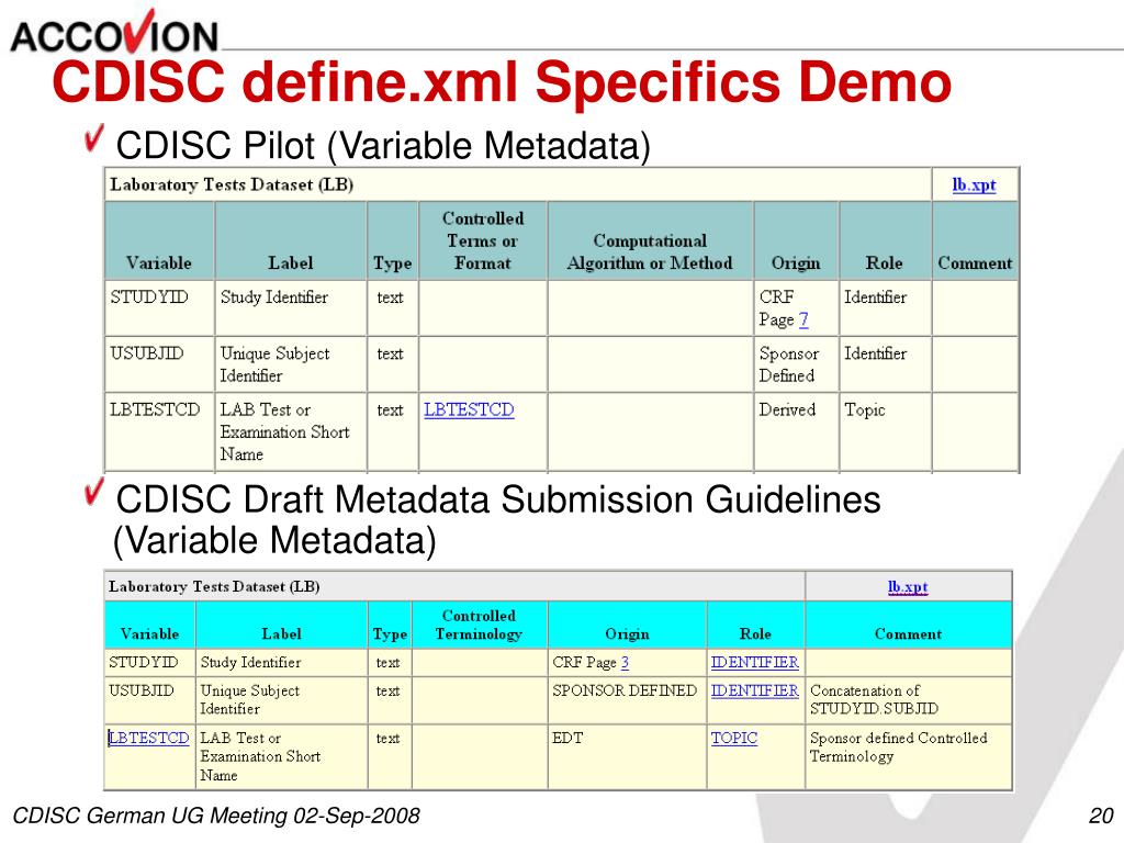 CDISC define.xml Specifics Demo • CDISC Pilot (Variable Metadata) • CDISC Draft Metadata Submission Guidelines(Variable Metadata)