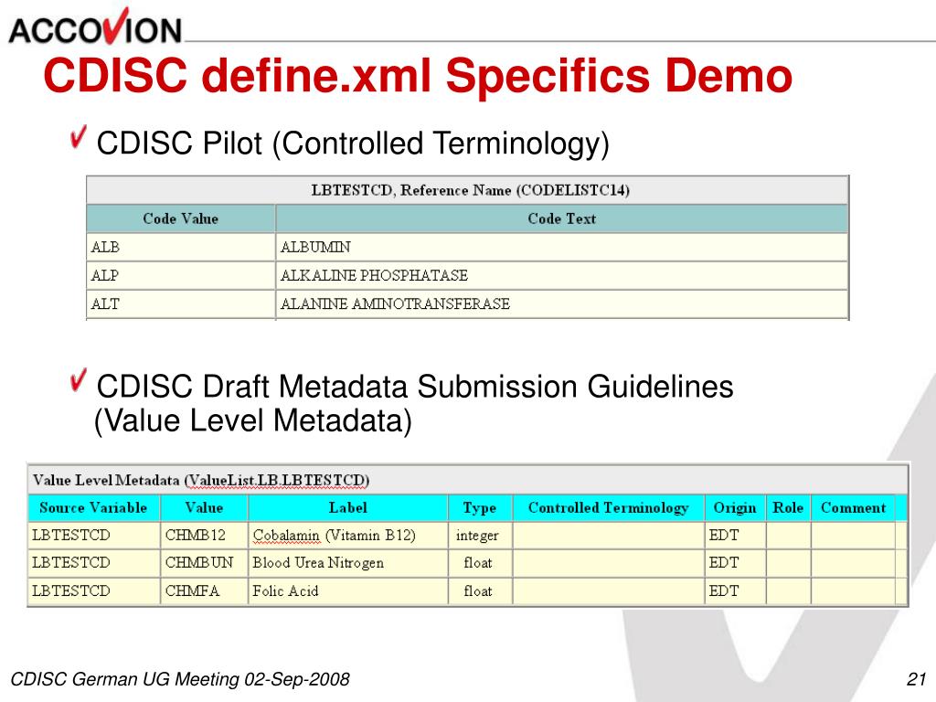 CDISC define.xml Specifics Demo • CDISC Pilot (Controlled Terminology) • CDISC Draft Metadata Submission Guidelines(Value Level Metadata)