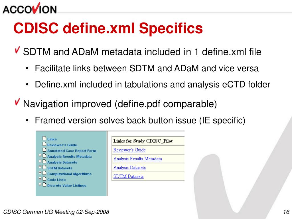 CDISC define.xml Specifics • SDTM and ADaM metadata included in 1 define.xml file • Facilitate links between SDTM and ADaM and vice versa • Define.xml included in tabulations and analysis eCTD folder • Navigation improved (define.pdf comparable) • Framed version solves back button issue (IE specific)