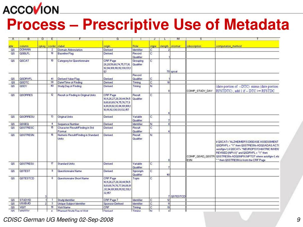 Process – Quality Control (QC) • QC of specifications • QC of programming/mapping against specifications • Option: independent re-programming • QC of Analysis Results against SAP • QC of define.xml • Verifying links and contents • Verifying of technical requirements via tools • Consistency via automated process based on metadata